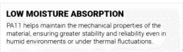 The PA10.10 base polymer ensures significantly reduced moisture absorption, improving long-term durability. Its excellent cold impact resistance makes it suitable for applications frequently exposed to low temperatures, such as outdoor environments and high-altitude settings.